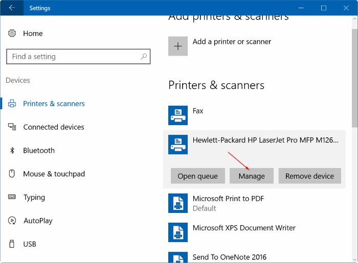 - Haga clic en la impresora a la que desea cambiarle el nombre y luego haga clic en el botón Administrar