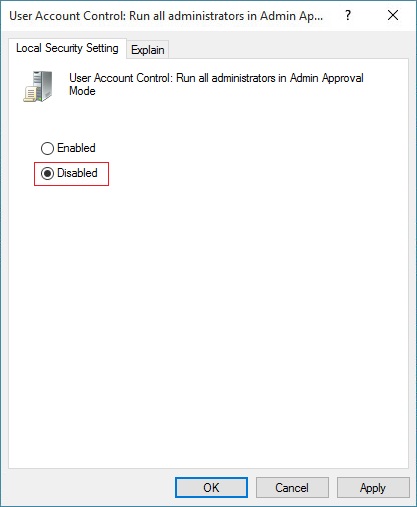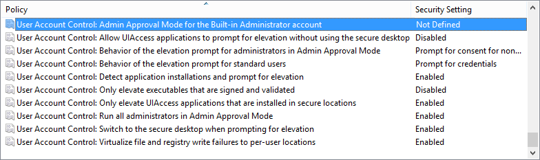 3.Asegúrese de que Opciones de Seguridad esté resaltada en la ventana izquierda y luego en el panel de la ventana derecha busque «Control de Cuentas de Usuario»: Ejecutar todos los administradores en el modo de aprobación del administrador».