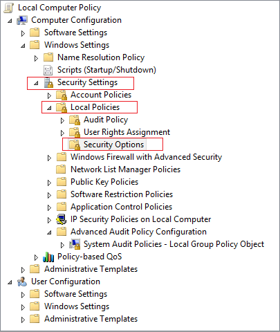 2.A continuación, navegue a Configuración de seguridad> Políticas locales> Opciones de seguridad.