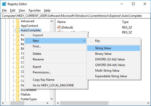 4.Ahora haga clic con el botón derecho del ratón en Autocompletar y seleccione Nuevo> Valor de la cadena. 5.Nombra esta nueva cadena como Append Completion y presiona Enter.