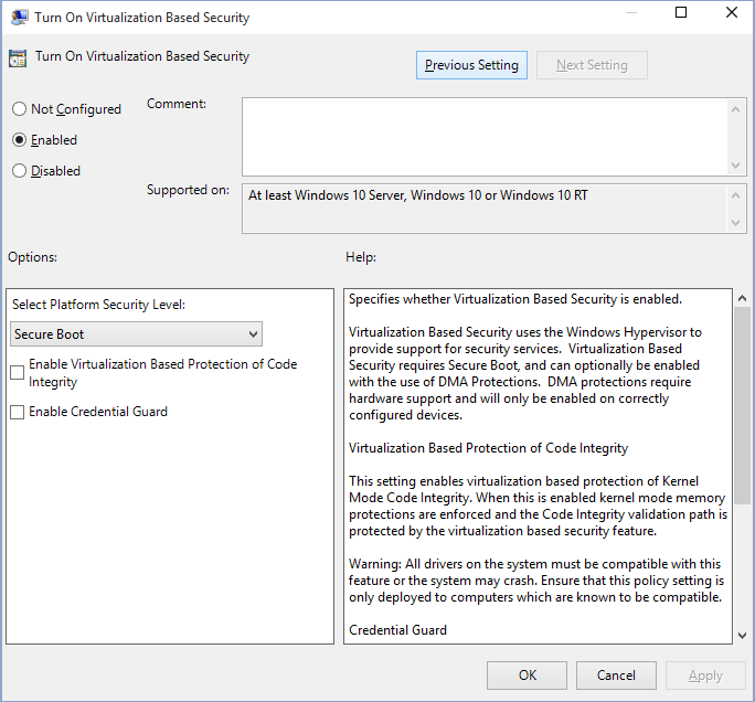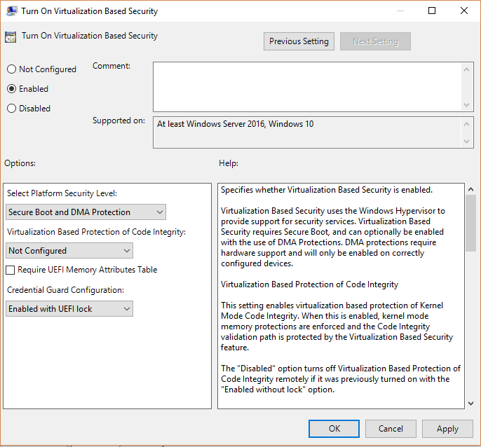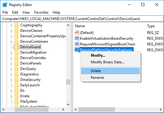 HKEY_MÁQUINA_LOCAL Sistema de Control de Corriente Control LSA LsaCfgFlagsHKEY_MÁQUINA_LOCAL Software Políticas Microsoft Windows DeviceGuard Habilitar la seguridad basada en la virtualización HKEY_MÁQUINA_LOCAL Software Políticas Microsoft Windows DeviceGuard Requerir Plataforma de Seguridad Características