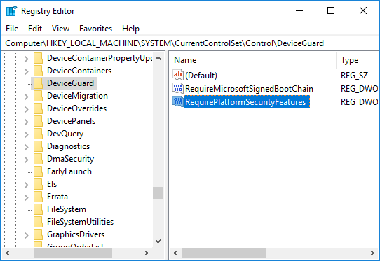 7.Haga doble clic en RequirePlatformSecurityFeatures DWORD y cambie su valor a 1 para usar sólo Secure Boot o configúrelo a 3 para usar la protección de Secure Boot y DMA.