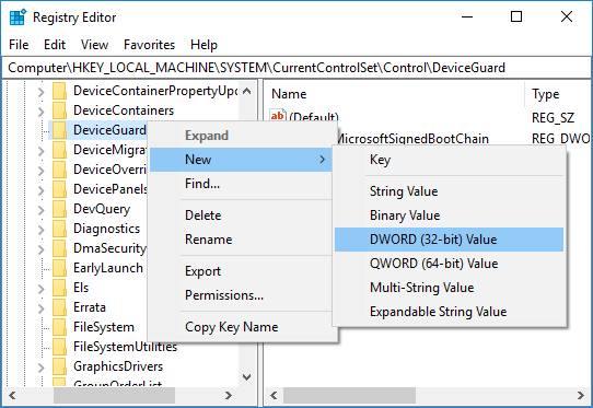 3.Haga clic con el botón derecho del ratón en DeviceGuard y seleccione New> DWORD (32-bit) Value.