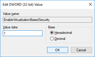 5.Haga doble clic en EnableVirtualizationBasedSecurity DWORD y cambie su valor a: