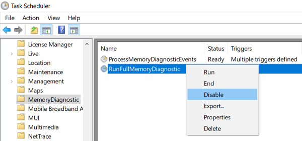 3.Haga clic con el botón derecho del ratón en RunFullMemoryDiagnostic y seleccione Disable.