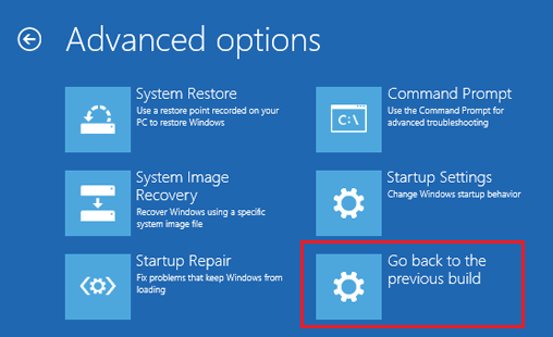 5.Desde la pantalla de Opciones Avanzadas, haz clic en «Volver a la construcción anterior».