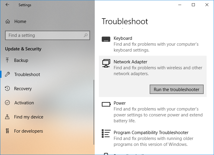 5.Si lo anterior no solucionó el problema, entonces desde la ventana de solución de problemas, haga clic en Adaptador de red y luego en Ejecutar el solucionador de problemas.