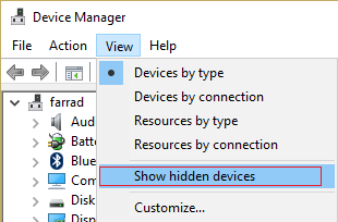 2.Expandir los adaptadores de red y luego hacer clic en Ver y seleccionar Mostrar los dispositivos ocultos.