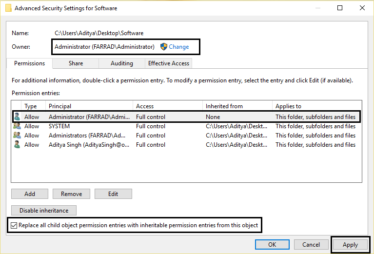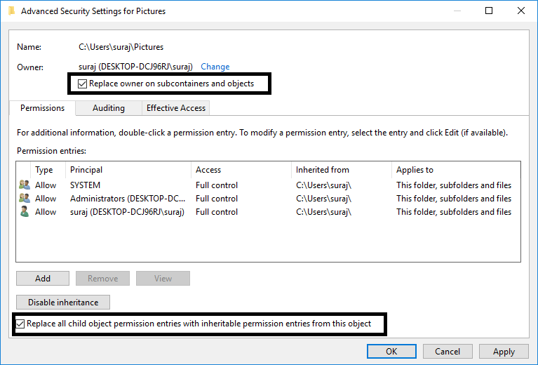 7.Ahora en la ventana de Configuración de Seguridad Avanzada, necesita marcar «Reemplazar el propietario en subcontenedores y objetos» y «Reemplazar todas las entradas de permisos de objetos menores con entradas de permisos hereditarios de este objeto». Una vez que hayas terminado con este paso, sólo tienes que hacer clic en Aplicar y luego en Aceptar.