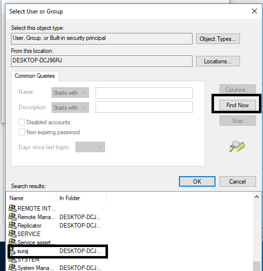 5.A continuación, debe hacer clic en Buscar ahora, que llenará algunas opciones en la misma pantalla. Ahora seleccione la cuenta de usuario deseada de la lista y haga clic en OK como se muestra en la siguiente imagen.