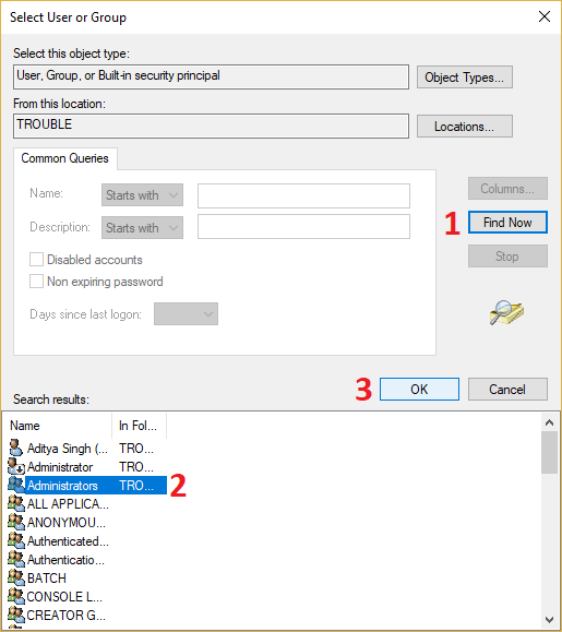 4.Luego haga clic en Buscar ahora y seleccione su cuenta de administrador y haga clic en OK.