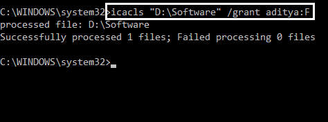 takeown /F «Drive_Name:_Full_Path_of_Folder_Name» /r /d y