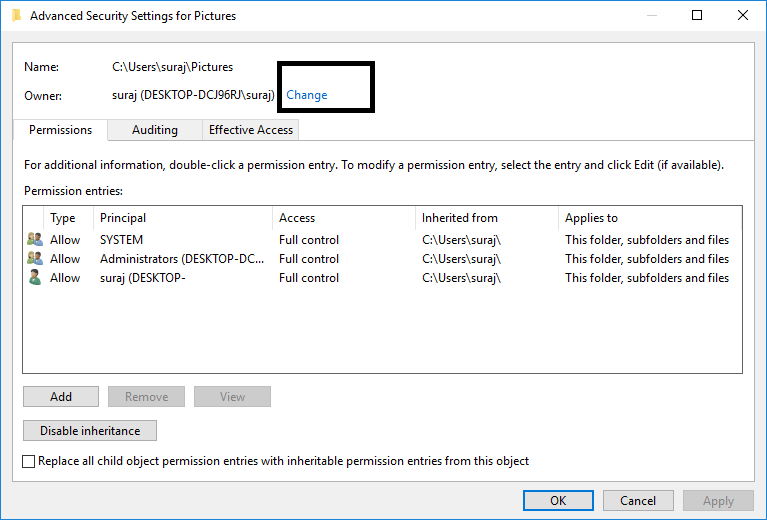 3.Ahora tienes que hacer clic en el enlace Cambiar junto al propietario actual del archivo o carpeta.