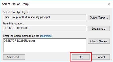 6.Una vez que seleccione la cuenta de usuario, haga clic en Aceptar y le llevará de nuevo a la ventana de Configuración de Seguridad Avanzada.
