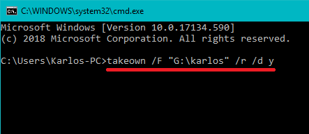 2.Para tomar el permiso de propiedad para borrar el archivo o la carpeta, debe ingresar el siguiente comando y presionar Enter: