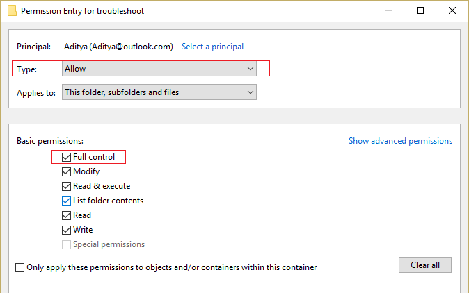 12.Asegúrese de marcar la casilla Control total y luego haga clic en Aceptar.