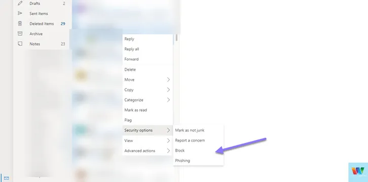 - Para impedir que esa dirección de correo electrónico envíe correos electrónicos a su dirección de correo electrónico de Outlook, haga clic con el botón derecho en > Opciones de seguridad > Bloquear.