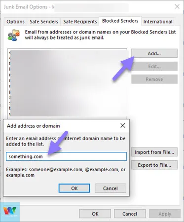 Por ejemplo, la dirección de correo electrónico es alguien@algo.com , puede bloquear el dominio algo.com. Hacer esto bloqueará todos los correos electrónicos provenientes del dominio. Esta es una forma mucho mejor de bloquear direcciones de correo electrónico en Outlook.