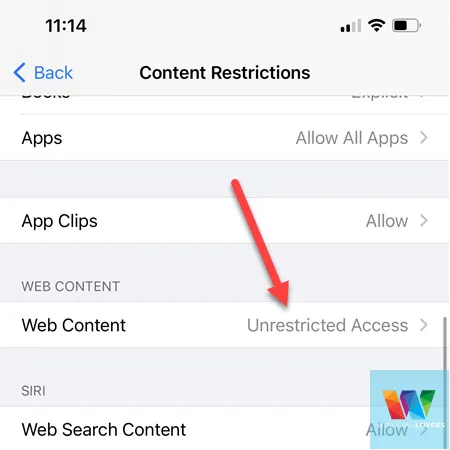Abra «Restricciones de contenido», desplácese hacia abajo hasta «CONTENIDO WEB» y tóquelo.