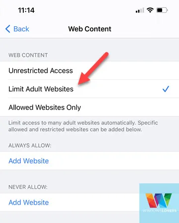 Ahora debería ver tres opciones diferentes para elegir. Toque «Limitar sitios web para adultos».