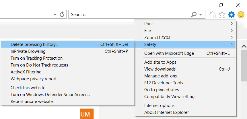 Para borrar el historial de navegación de Internet Explorer, debe hacer clic en Menú> Seguridad> Borrar el historial de navegación. Además, puede pulsar Ctrl+Mayús+Eliminar para abrir esta ventana.