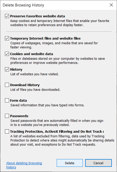 Una vez que elimine el historial de navegación, guardará las cookies y los archivos temporales. Necesitas desmarcar la opción «Conservar datos del sitio web de los favoritos» para asegurarte de que Internet Explorer lo borre todo.