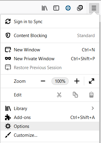 1.Abre Firefox y haz clic en las tres líneas paralelas (Menú) y selecciona Opciones.