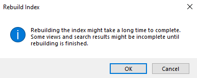 8.Aparecerá un cuadro de advertencia del Índice de Reconstrucción que le avisa de que algunos contenidos pueden no estar disponibles en la búsqueda hasta que la reconstrucción haya terminado. Haga clic en OK para cerrar el mensaje de advertencia.