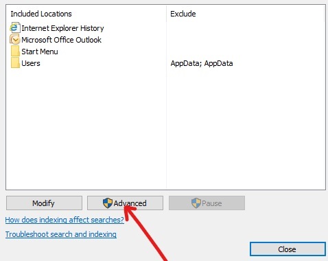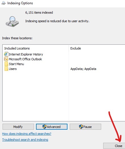 2.Haga clic en las Opciones de indexación que aparecerán como resultado en la parte superior o simplemente pulse el botón de entrada del teclado. Debajo aparecerá un cuadro de diálogo.