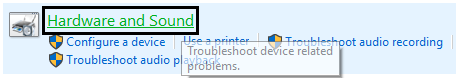 2.En los resultados de la búsqueda, haga clic en «Solución de problemas» y luego seleccione «Hardware y sonido».