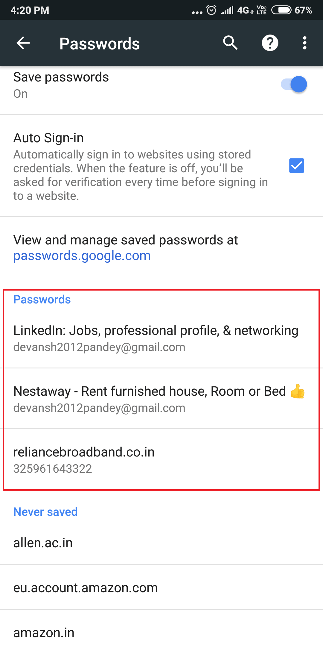 4.En la pantalla «Guardar contraseña», puedes ver todas las contraseñas guardadas para todos los sitios en el cromo.