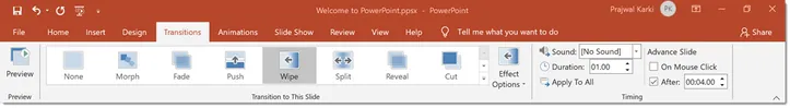 Una vez que haya creado todas las diapositivas necesarias, haga clic en la pestaña «Transiciones» en la parte superior de la barra de herramientas.