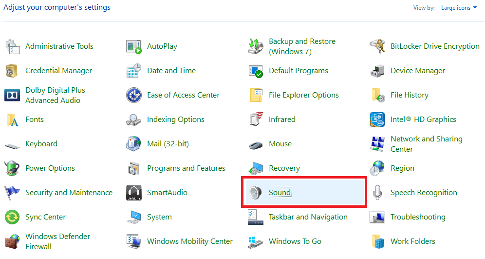 o en el Panel de Control seleccione Iconos grandes en Ver por desplegable y luego haga clic en la opción Sonido.