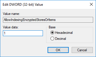 7.Haga doble clic en AllowIndexingEncryptedStoresOrItems para cambiar su valor según: