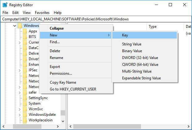 3.Si no puede encontrar la búsqueda de Windows, haga clic con el botón derecho del ratón en Windows y seleccione Nuevo> Clave.