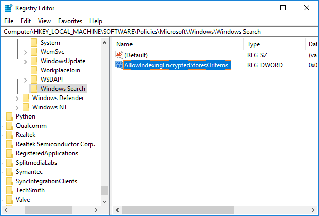 6.Nombra esta nueva DWORD como AllowIndexingEncryptedStoresOrItems y presiona Enter.