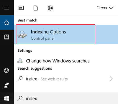 1.Presione la tecla de Windows + Q para abrir la búsqueda, luego escriba la indexación y haga clic en «Opciones de indexación» del resultado de la búsqueda.