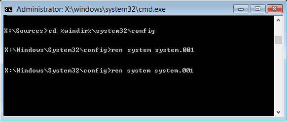 cd %windir%system32config sistema ren sistema.001 ren software software.001