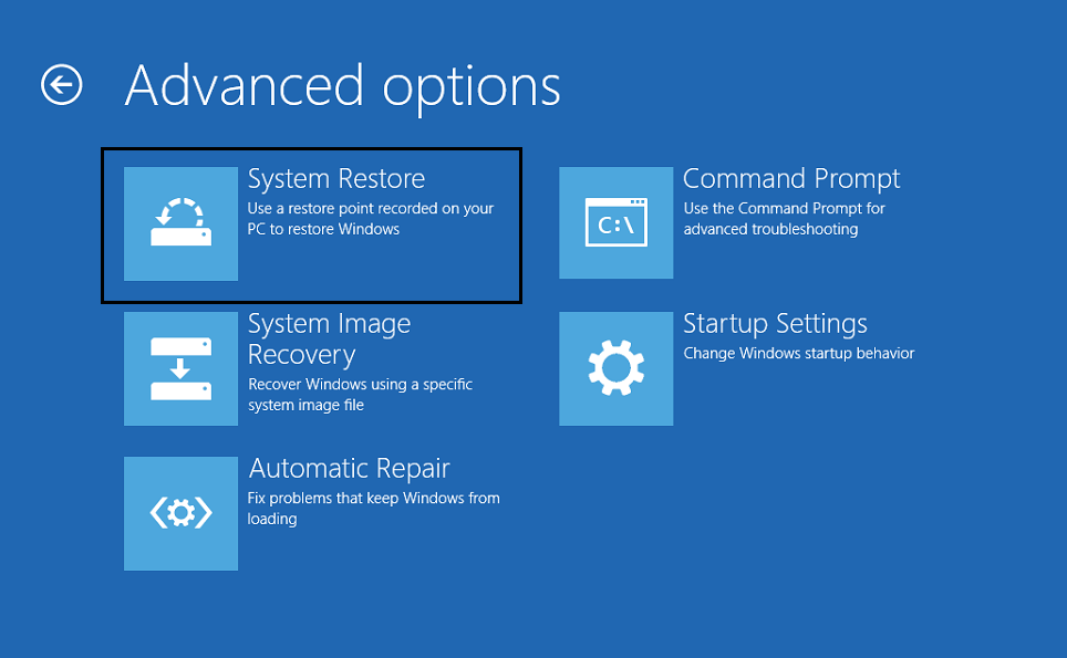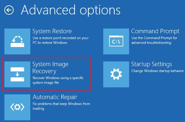 6.En la pantalla de opciones avanzadas, haga clic en Seleccionar recuperar de la unidad o en Recuperación de la imagen del sistema.