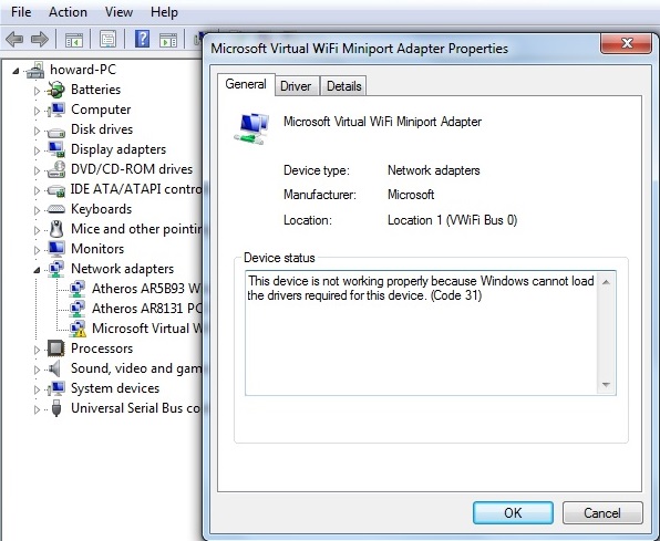 Arreglar el problema del controlador del adaptador del minipuerto de Microsoft Virtual Wifi (código de error 31):Un código de error 31 puede deberse a una serie de razones que impiden que el sistema operativo (Windows) cargue los controladores necesarios para un dispositivo concreto. Básicamente, el Microsoft Virtual Wifi Miniport Adapter es sólo un dispositivo virtual que virtualiza su adaptador de red, es lo mismo que VMWare virtualiza diferentes sistemas operativos.