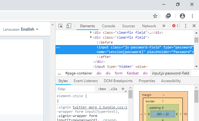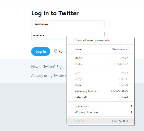 2.Ahora, queremos cambiar el guión de este campo de entrada para que nos permita ver la contraseña. Selecciona el campo de la contraseña y haz clic con el botón derecho del ratón sobre él. Haga clic en «Inspeccionar» o «Inspeccionar elemento» dependiendo de su navegador.