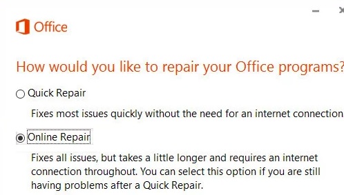 - En la ventana Cómo quiere restaurar los programas de Office, seleccione Reparar en línea.